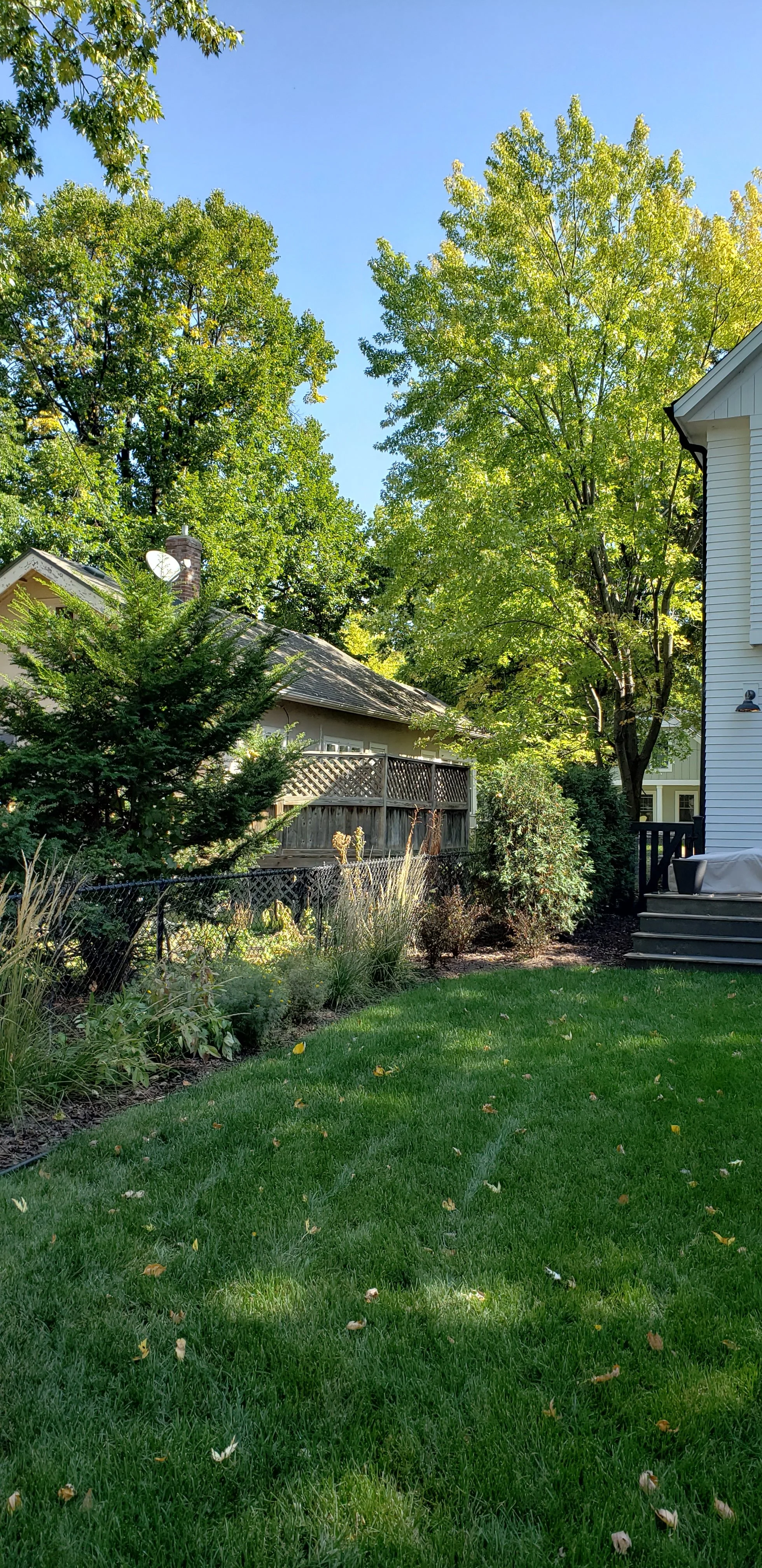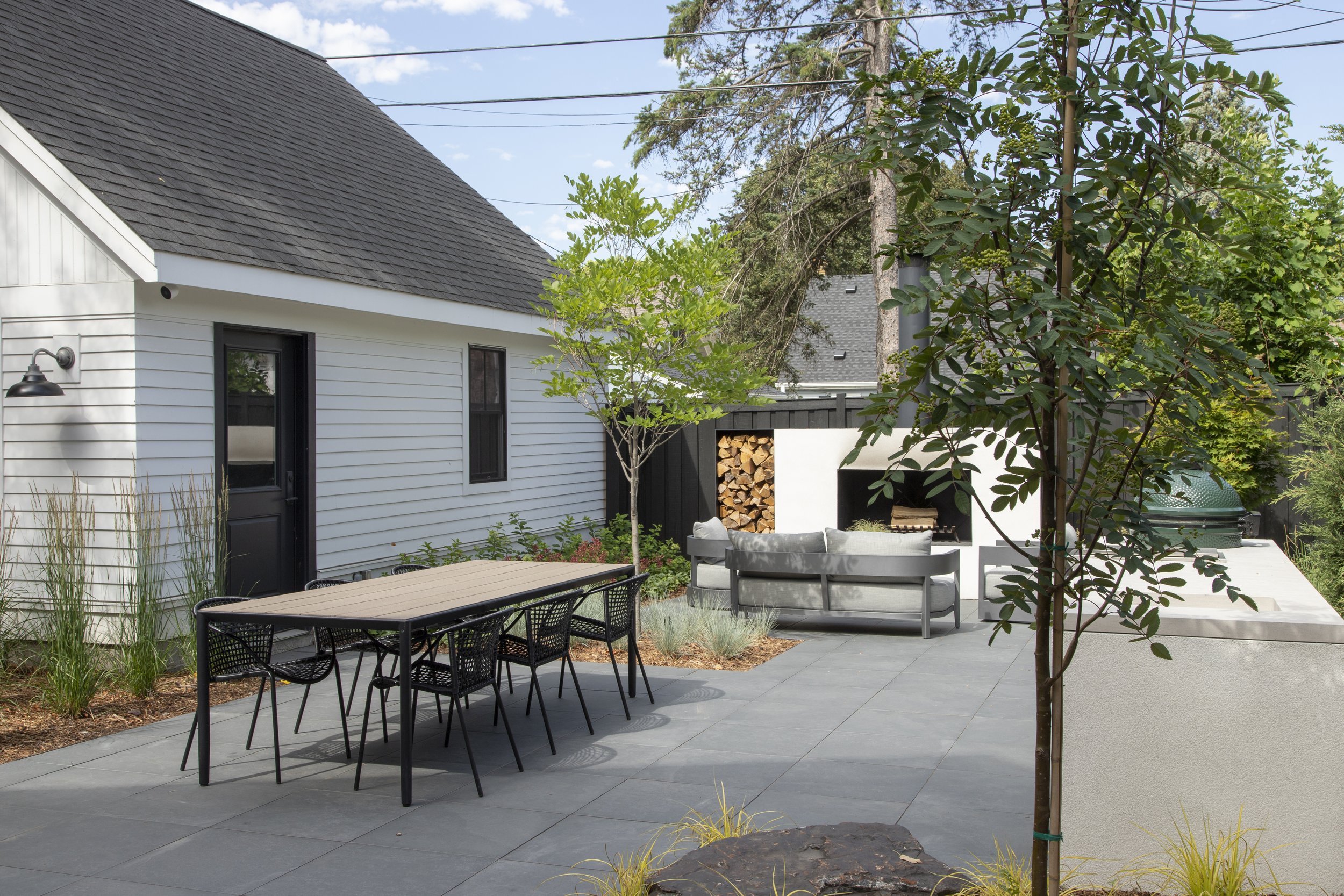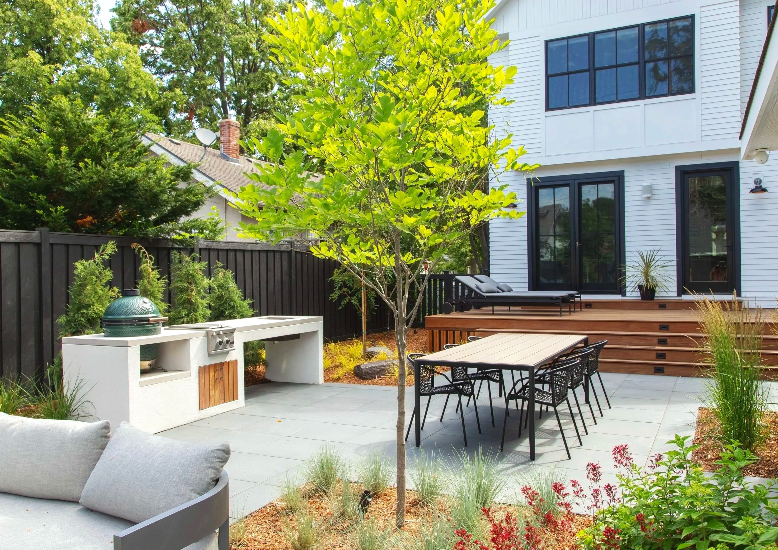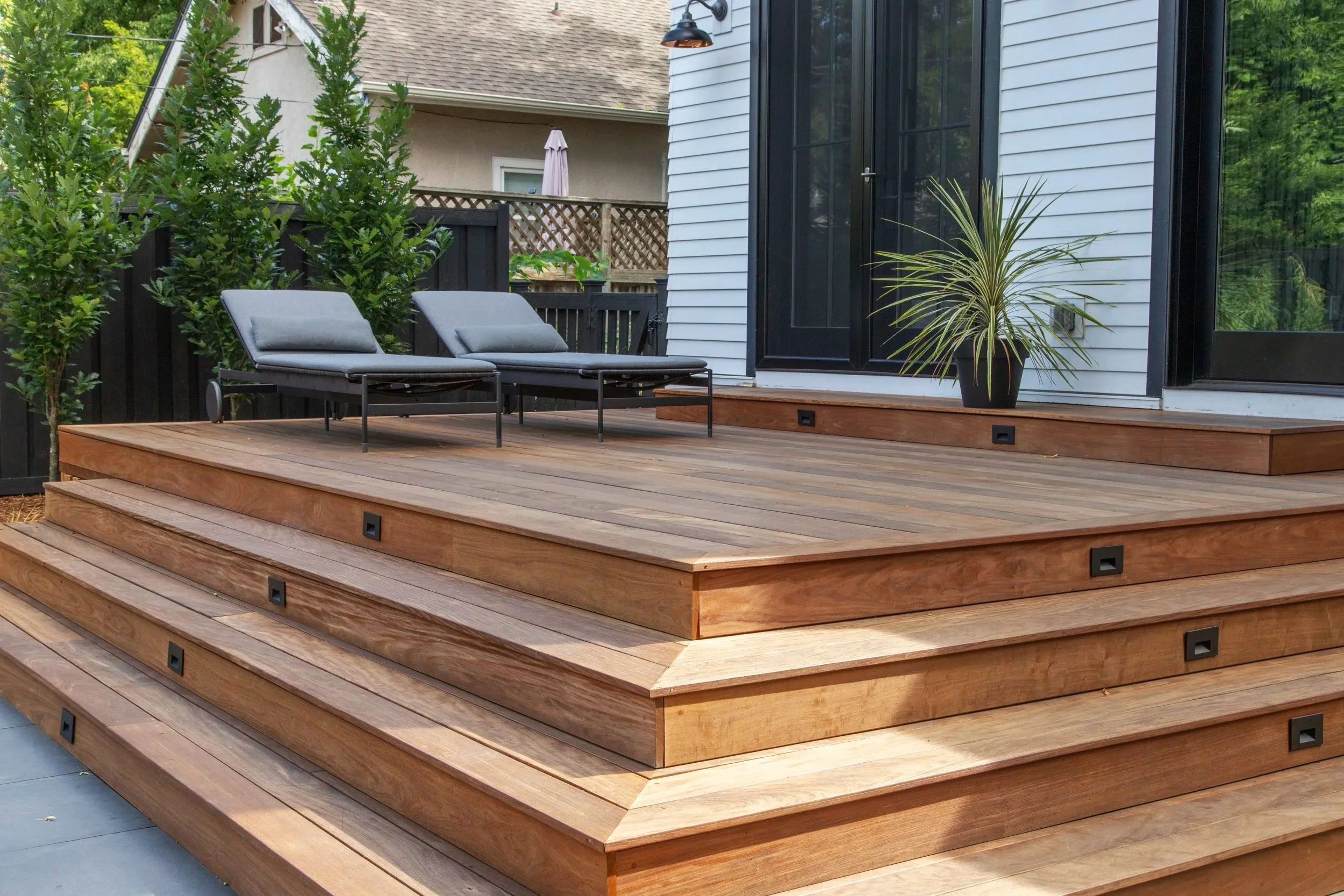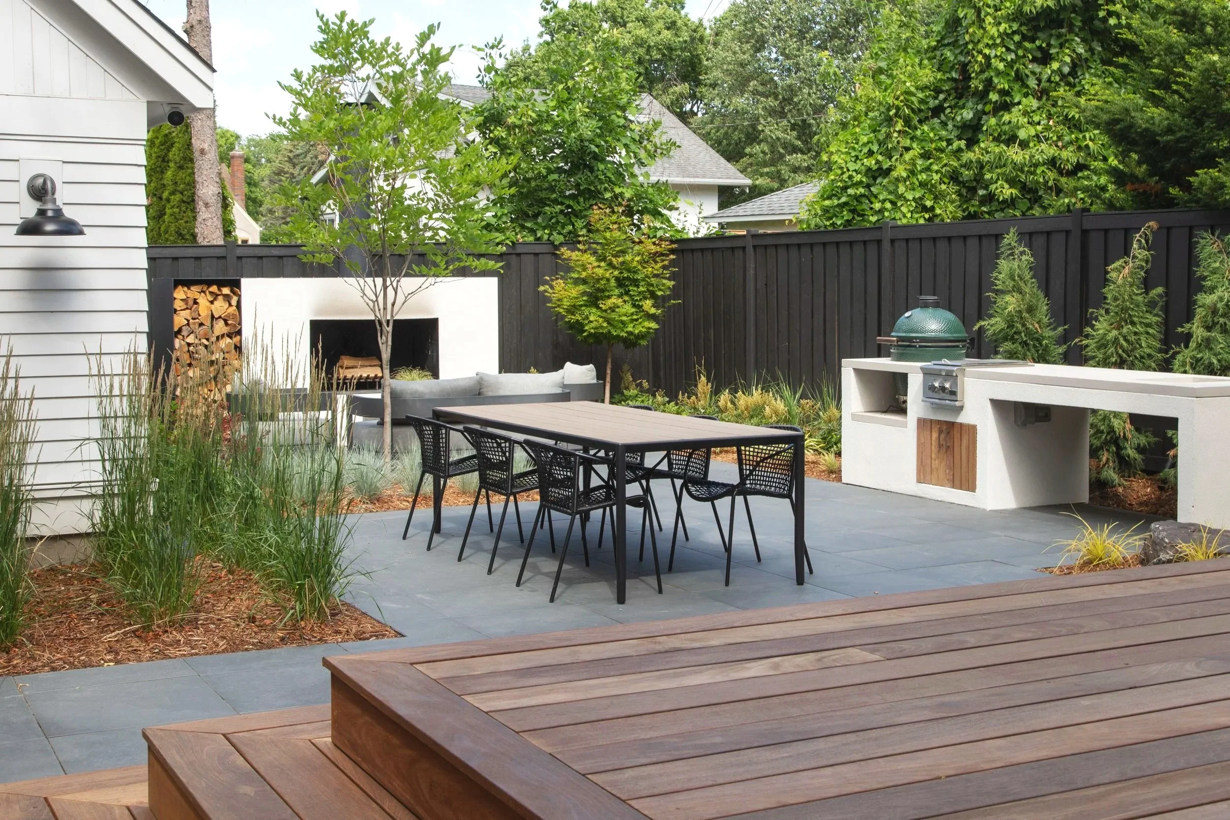 An ipe deck flows seamlessly into Frontier Vintage Slab porcelain patio – materials chosen not just for their beauty but for their ability to stay looking pristine with minimal maintenance, a critical consideration for people who want their outdoor space to remain as tidy as their interior. Waterfall steps connect the different levels with architectural grace, their linear form echoing the home's modern sensibility. The result is a landscape that satisfies an uncommon need: outdoor living for people who love to entertain but refuse to sacrifice their preference for order, cleanliness, and a cohesive aesthetic that extends from front door to back fence.