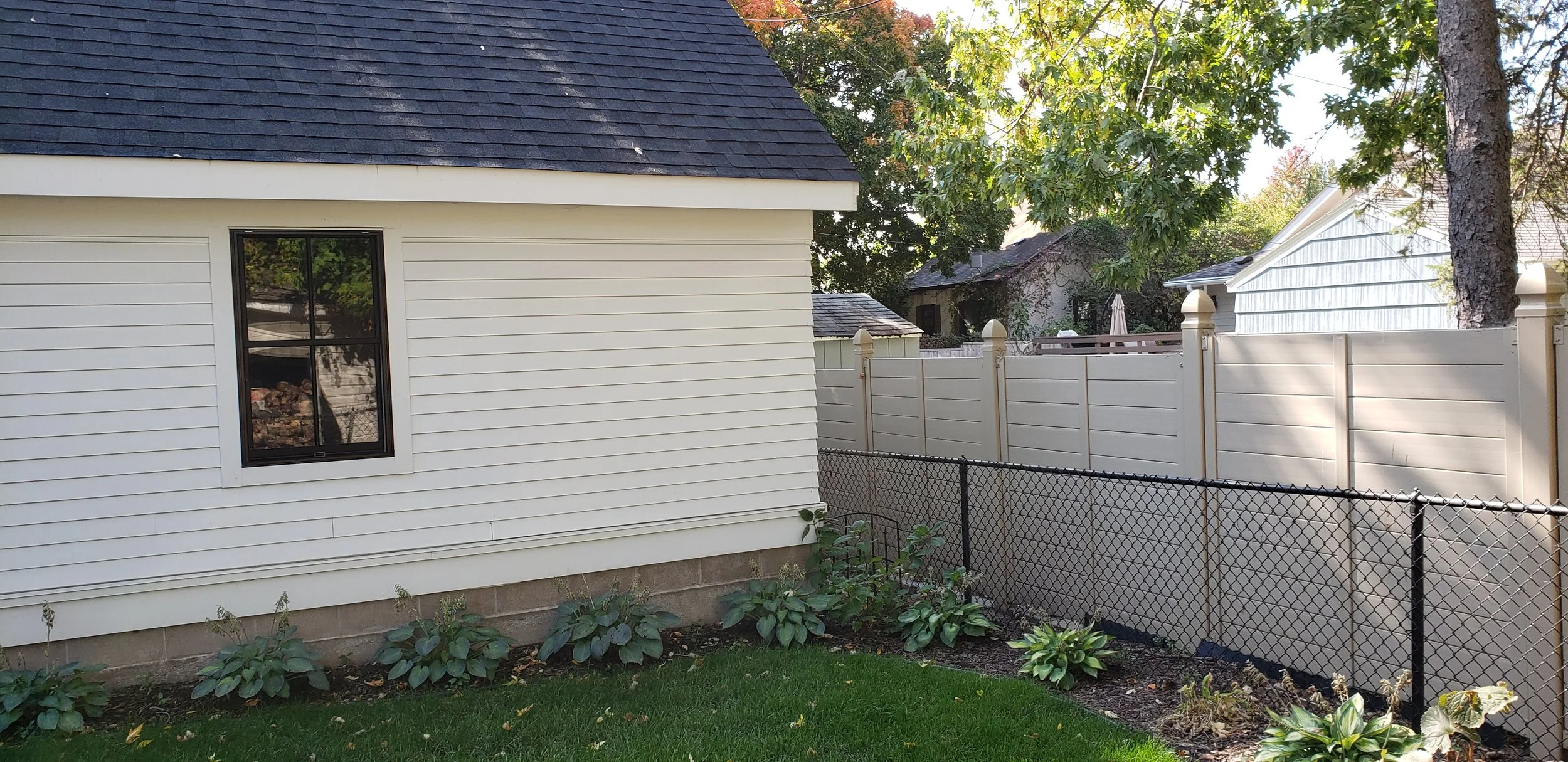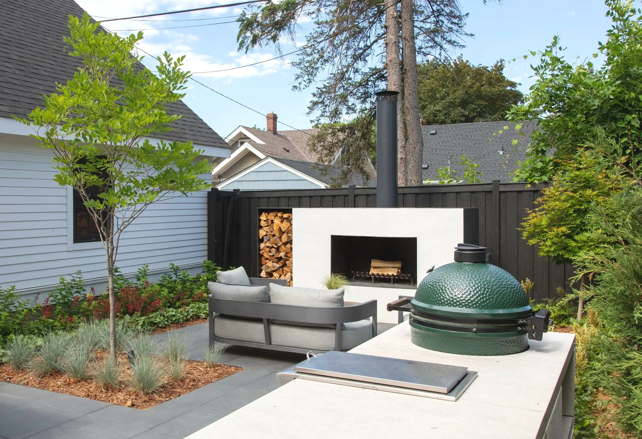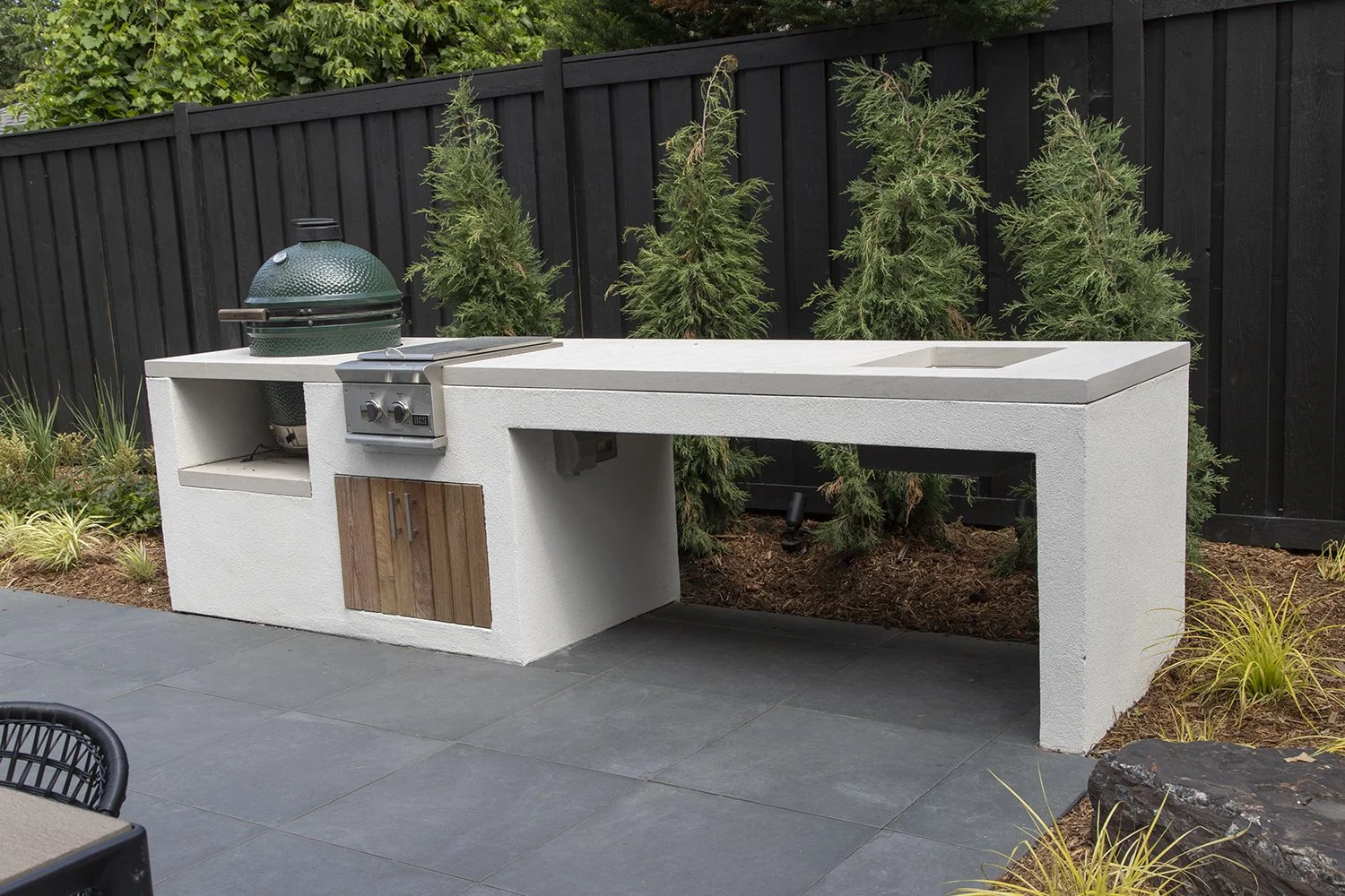 For homeowners who value precision and order in every detail, this backyard transformation honors their exacting standards with a design built around clean lines, tonal harmony, and meticulous craftsmanship. The clients wanted an outdoor kitchen and fireplace that would extend their indoor living space without compromising their carefully curated aesthetic – a light, monochromatic palette that feels serene rather than stark. Custom stucco cladding on the outdoor kitchen matches the home's exterior exactly, creating visual continuity that makes the structure feel like it was always part of the original architecture. An Indiana limestone counter provides both workspace and a natural complement to the white-on-white theme, while the fire feature anchors the gathering space with warmth that doesn't disrupt the calm.